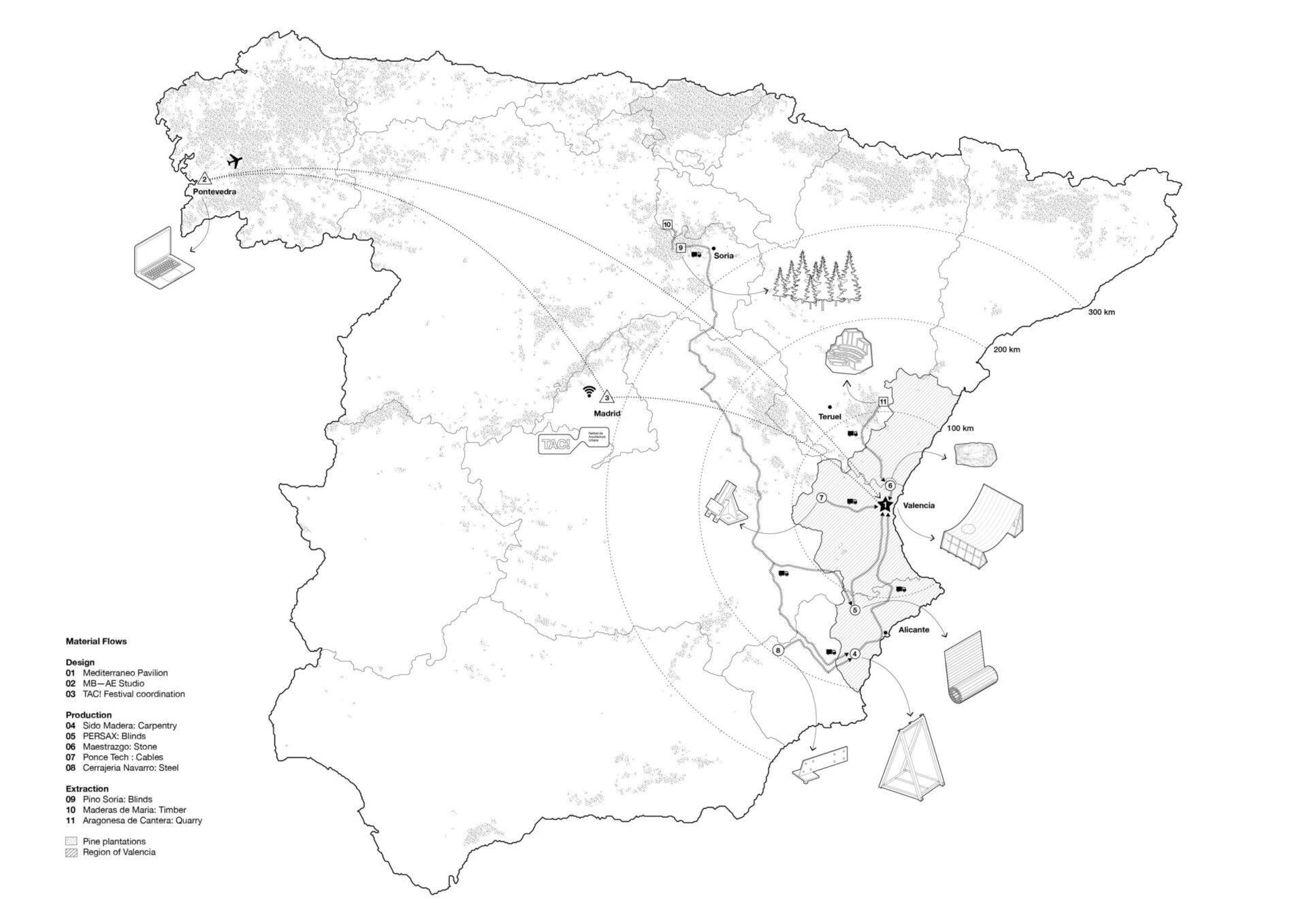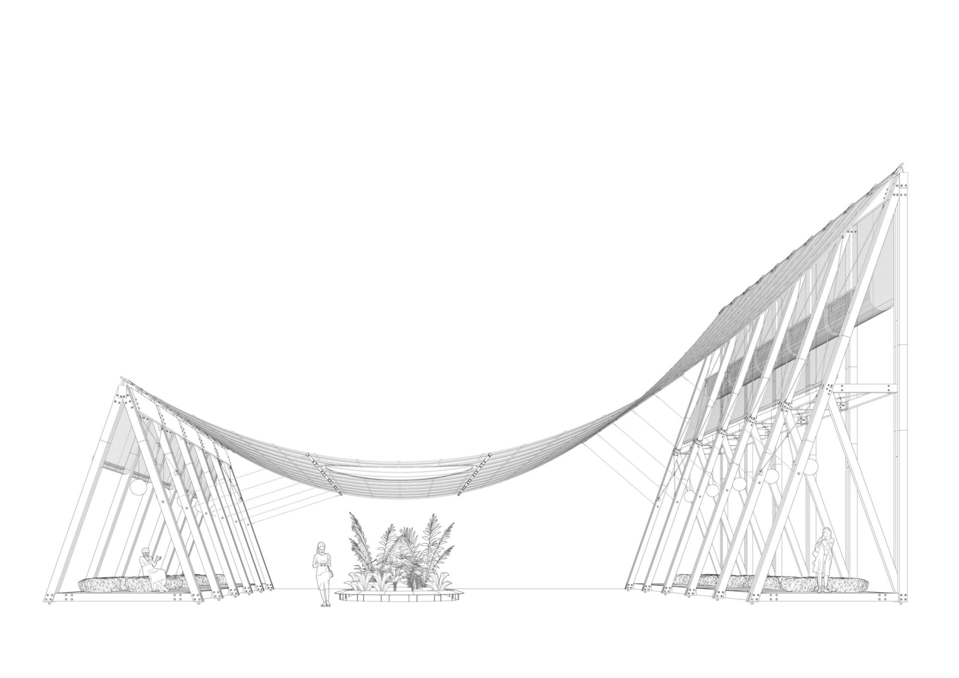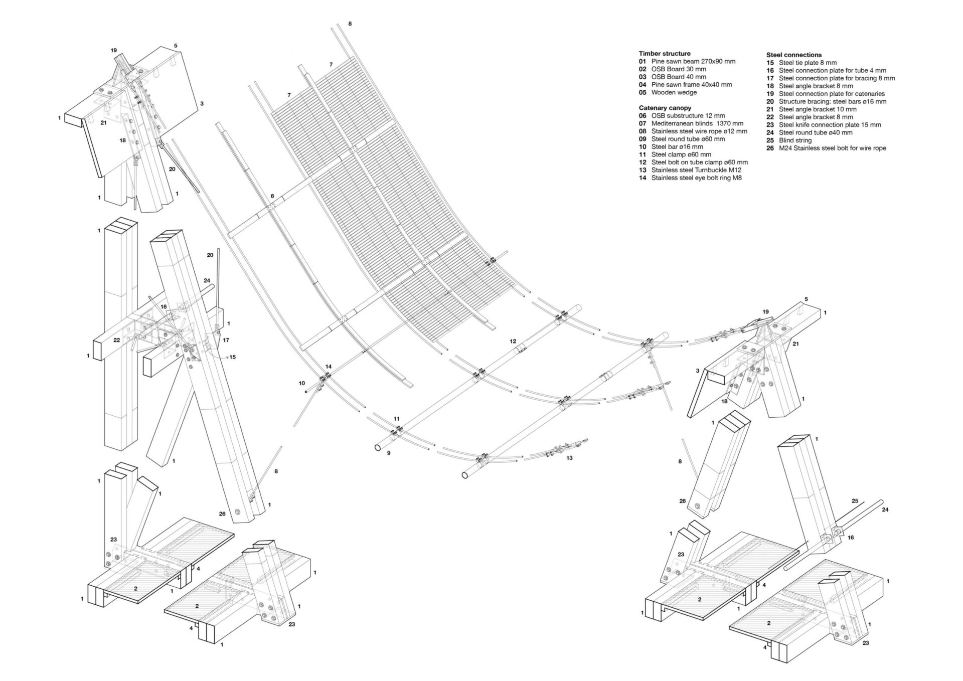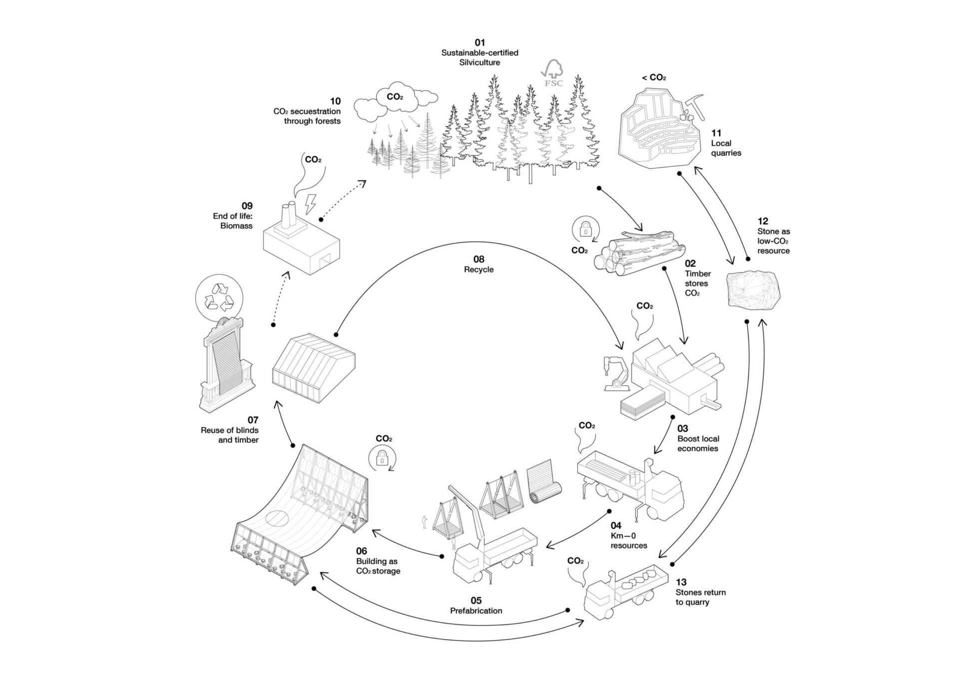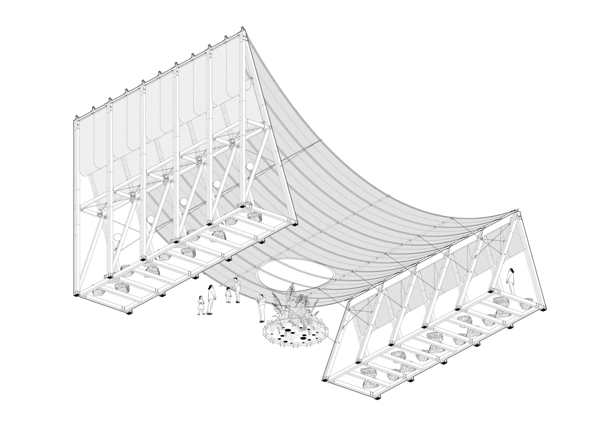 El proyecto también destaca la importancia de devolver los componentes al lugar de origen una vez que se desmonte el pabellón, fomentando así la recirculación de los materiales y la sostenibilidad.