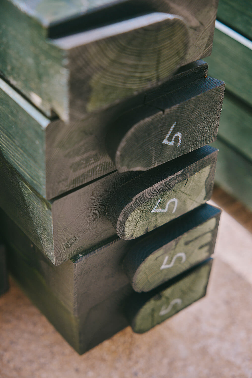 La madera proviene de los bosques de pino en Soria, las persianas son de la localidad de Sax en Alicante, y las piedras se obtienen de las canteras de Teruel promoviendo una economía circular y sostenible.